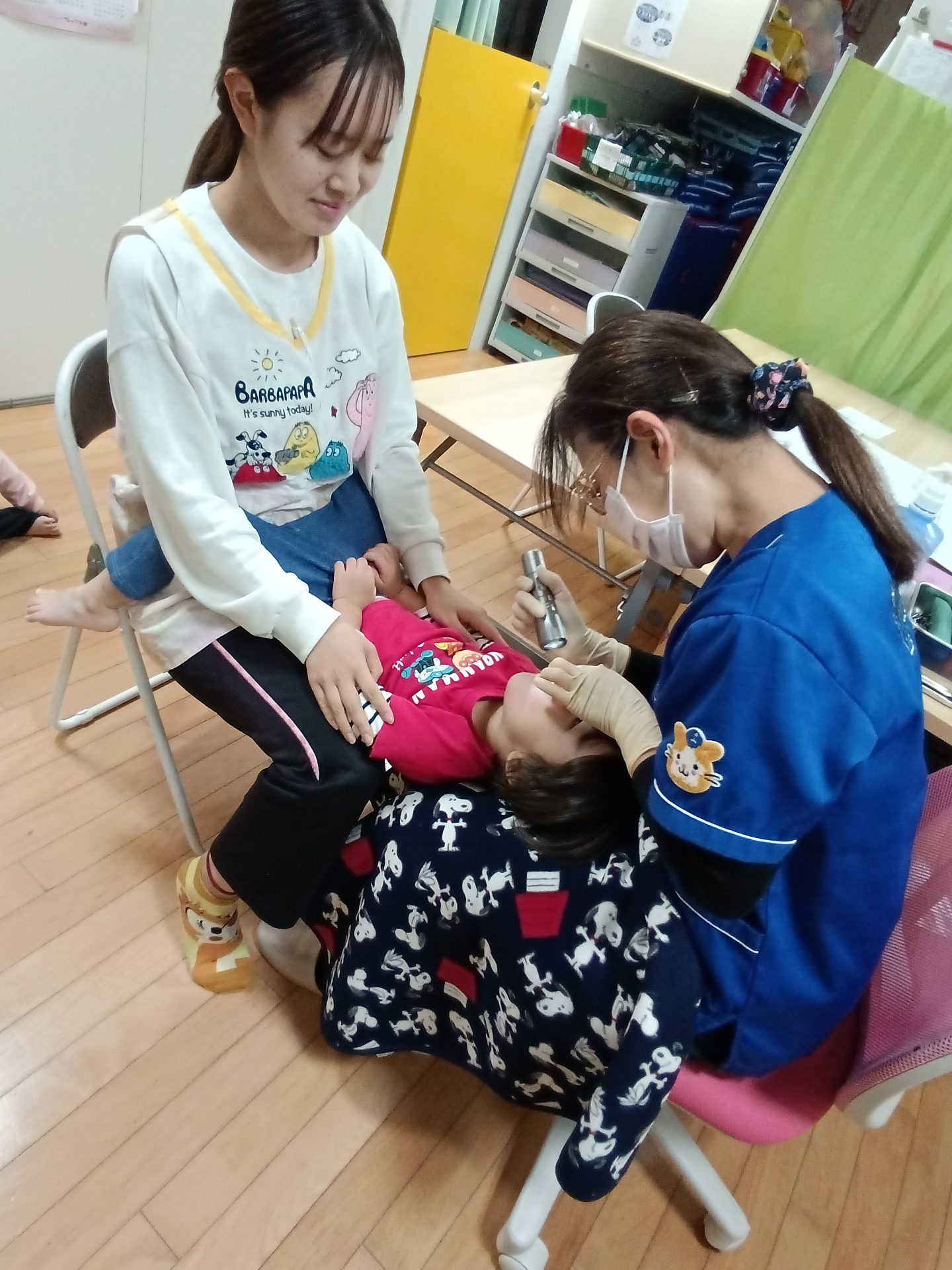 もも組になると、大きな口を開けて久保先生(歯科医)に「上手だねー」とほめてもらいました。