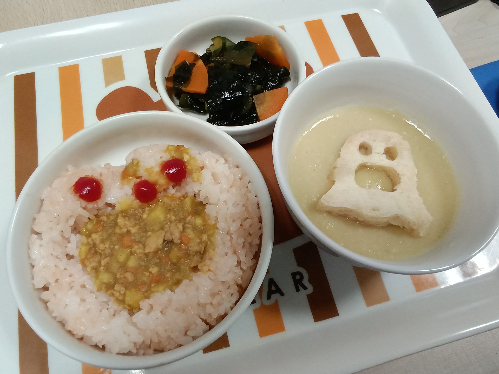 ★ 給食はハロウィンカレー さつまいものポタージュに浮いているおばけラスクに大喜びでした!