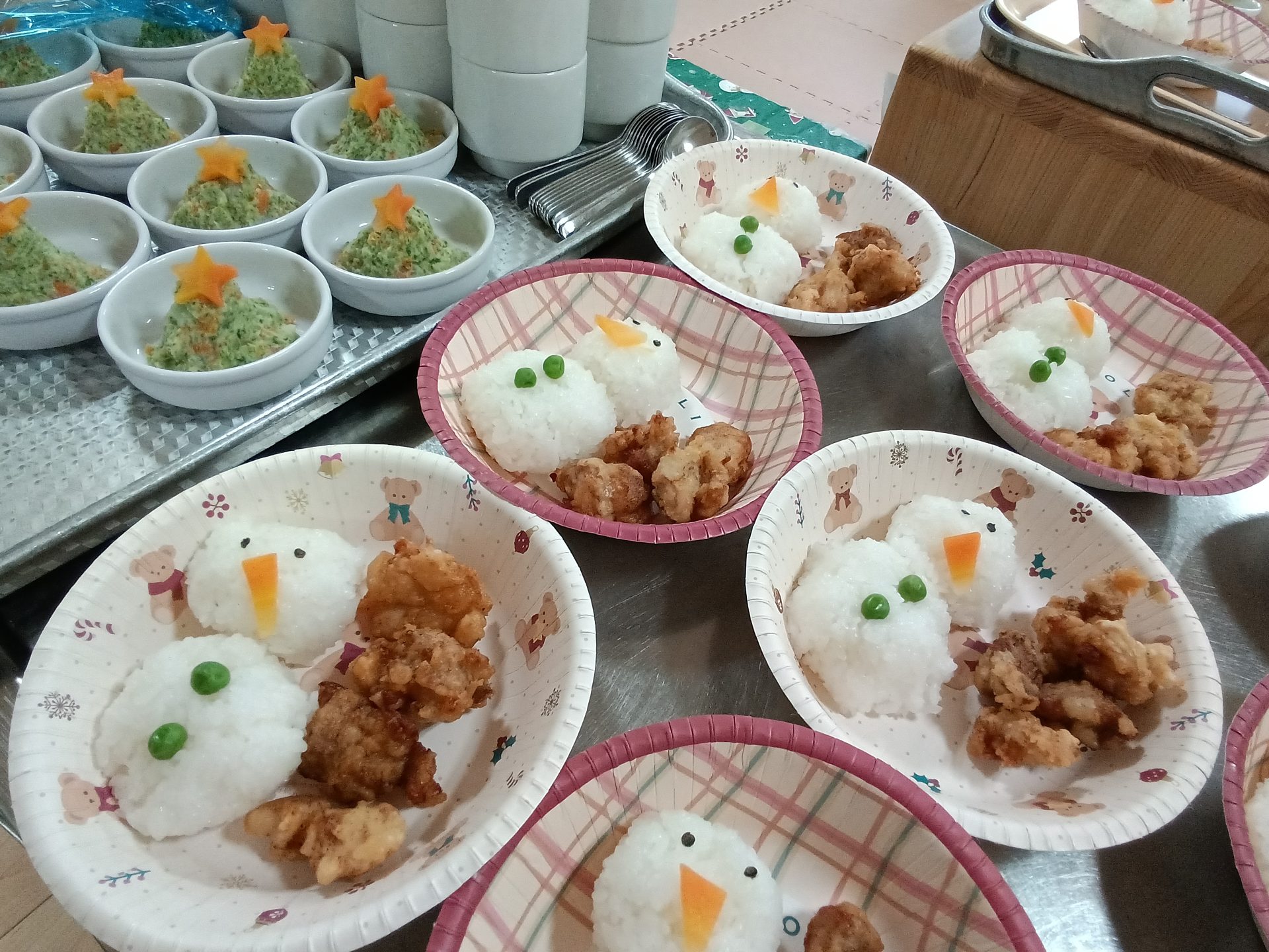 給食を並べると、「ゆきだるまだ!」「くりすますだから?」と